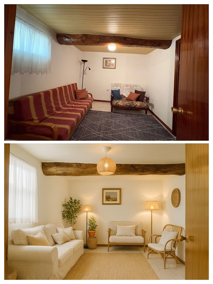 Con pequeños cambios estratégicos, el salón se transformó en un espacio luminoso, acogedor y elegante. Se eligieron tonos claros y neutros que amplían visualmente la estancia, acompañados por textiles suaves y naturales. Los nuevos muebles de líneas sencillas invitan al relax y a la conversación, mientras que las plantas y la iluminación cálida aportan vida y frescura. La viga de madera, ahora protagonista, se integra de manera perfecta en un estilo natural y atemporal que realza el encanto de la estancia.